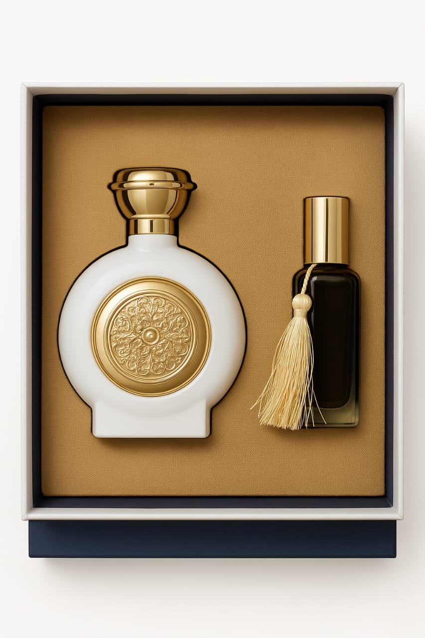 Discover timeless elegance with this premium perfume gift set crafted for fragrance lovers. The centerpiece is a stunning white round perfume bottle with golden detailing, symbolizing luxury and refinement. It is paired with a stylish mini travel bottle, making it easy to carry your favorite scent wherever you go.